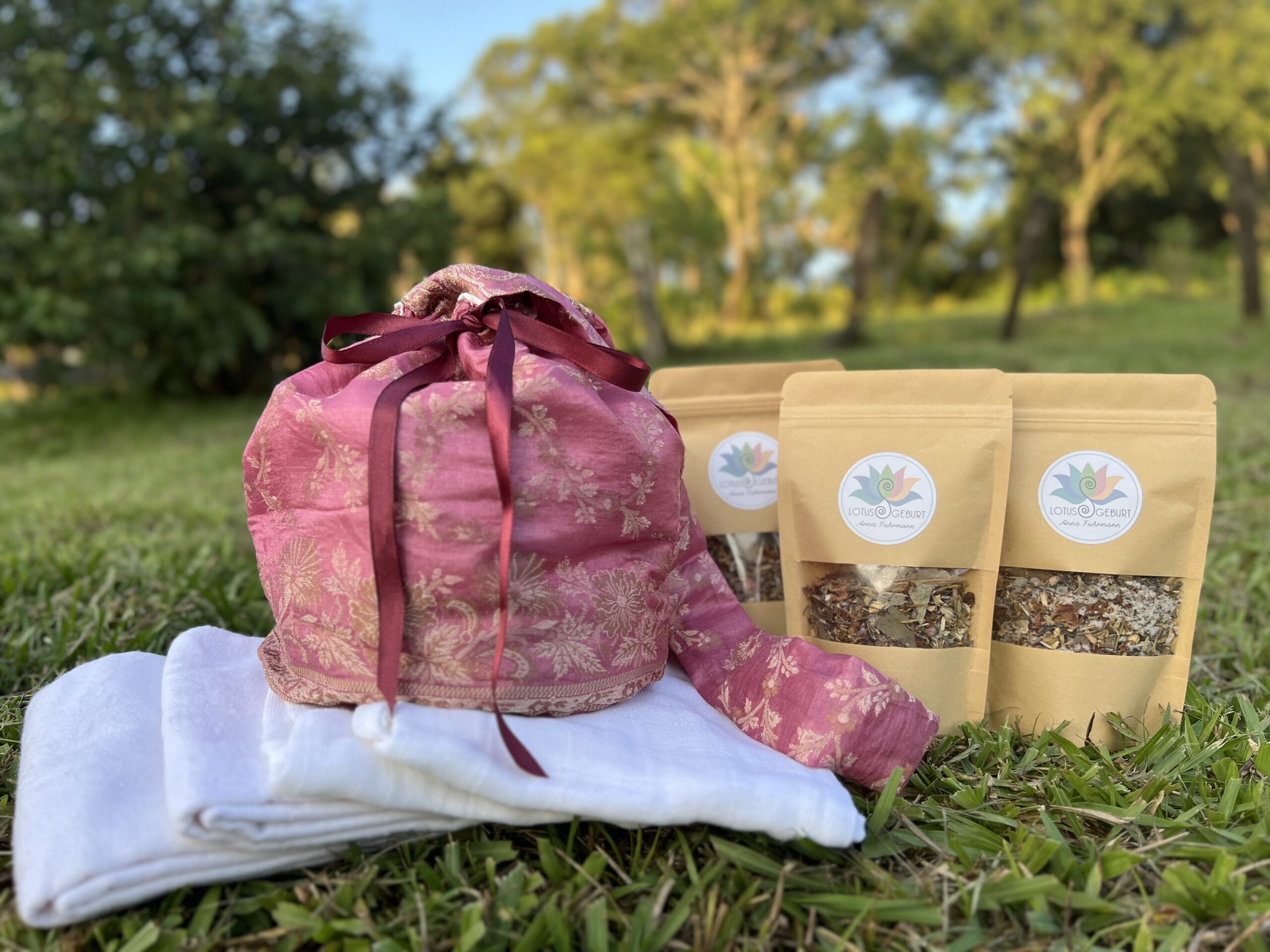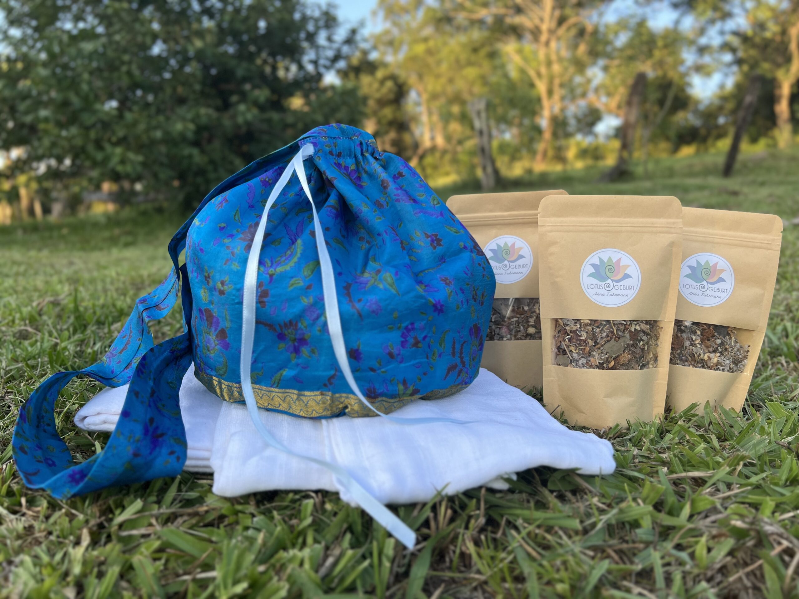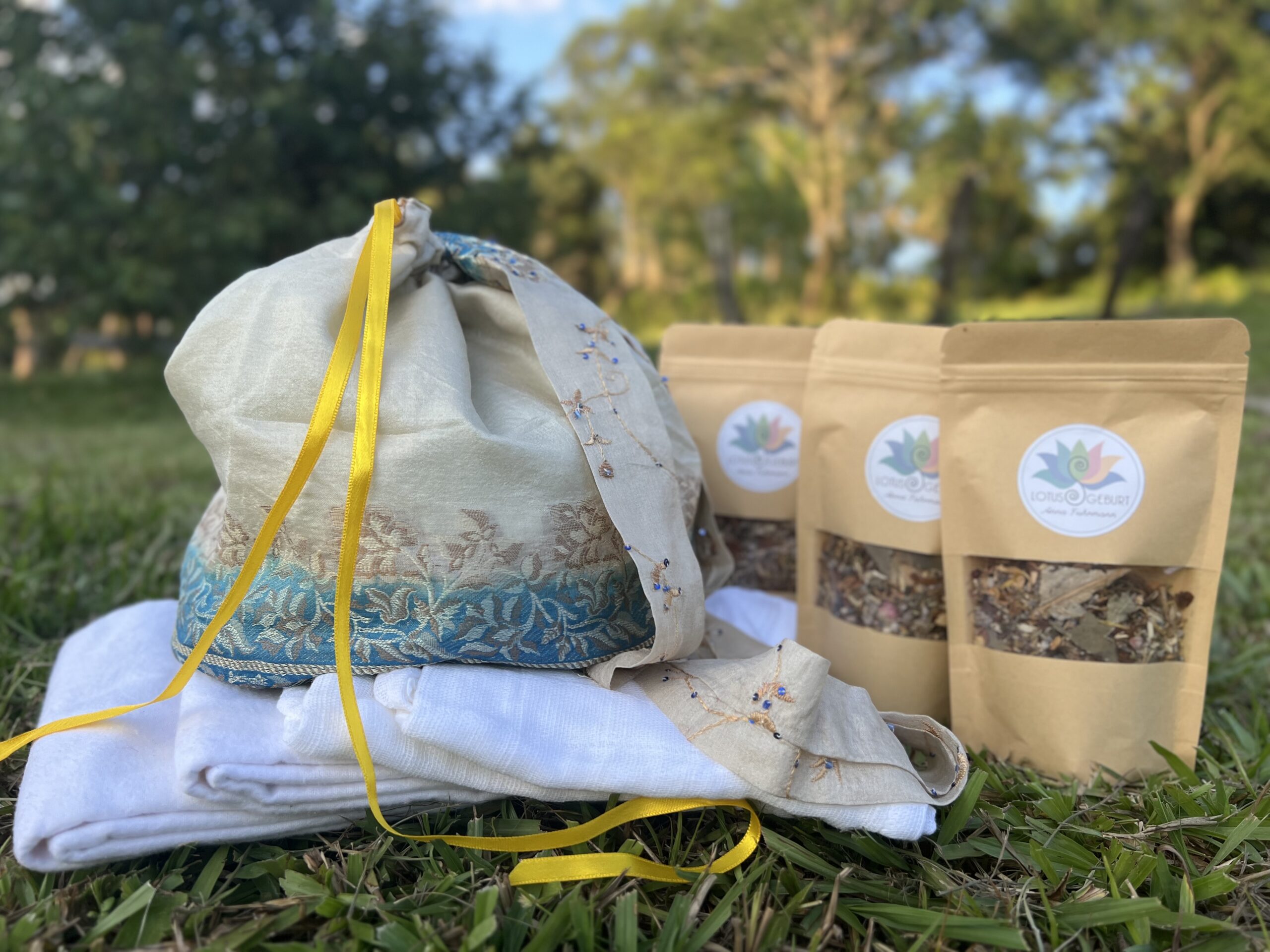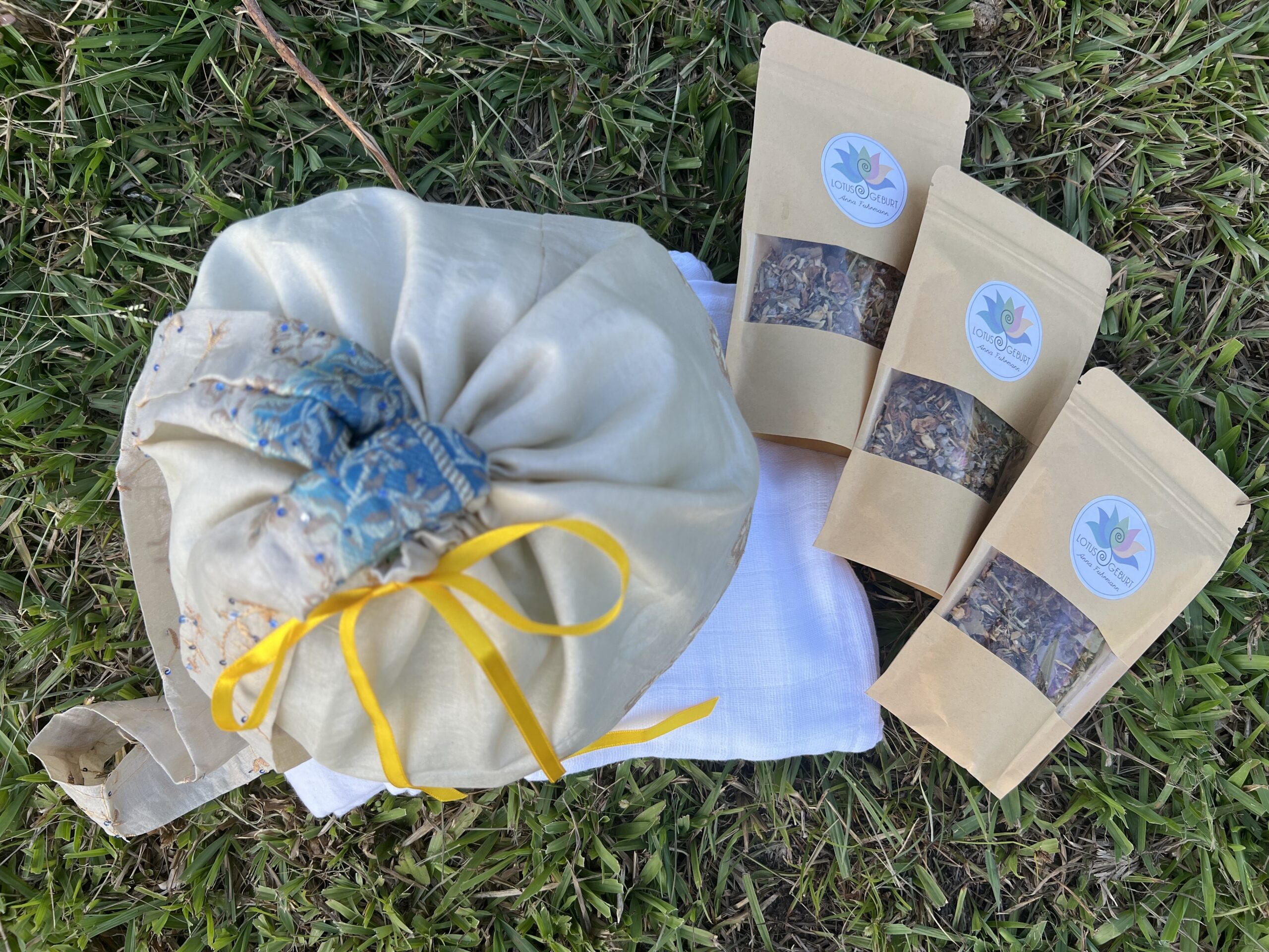 Das große 8-teilige rundum-sorglos-Paket für die Lotusgeburt besteht aus einer Plazenta-Tasche mit der Farbe deiner Wahl, 3 Kräuter-Salzmischungen mit je 180 g Inhalt, 2 Mullwindeln und 2 Moltontücher, jeweils aus reiner Baumwolle.