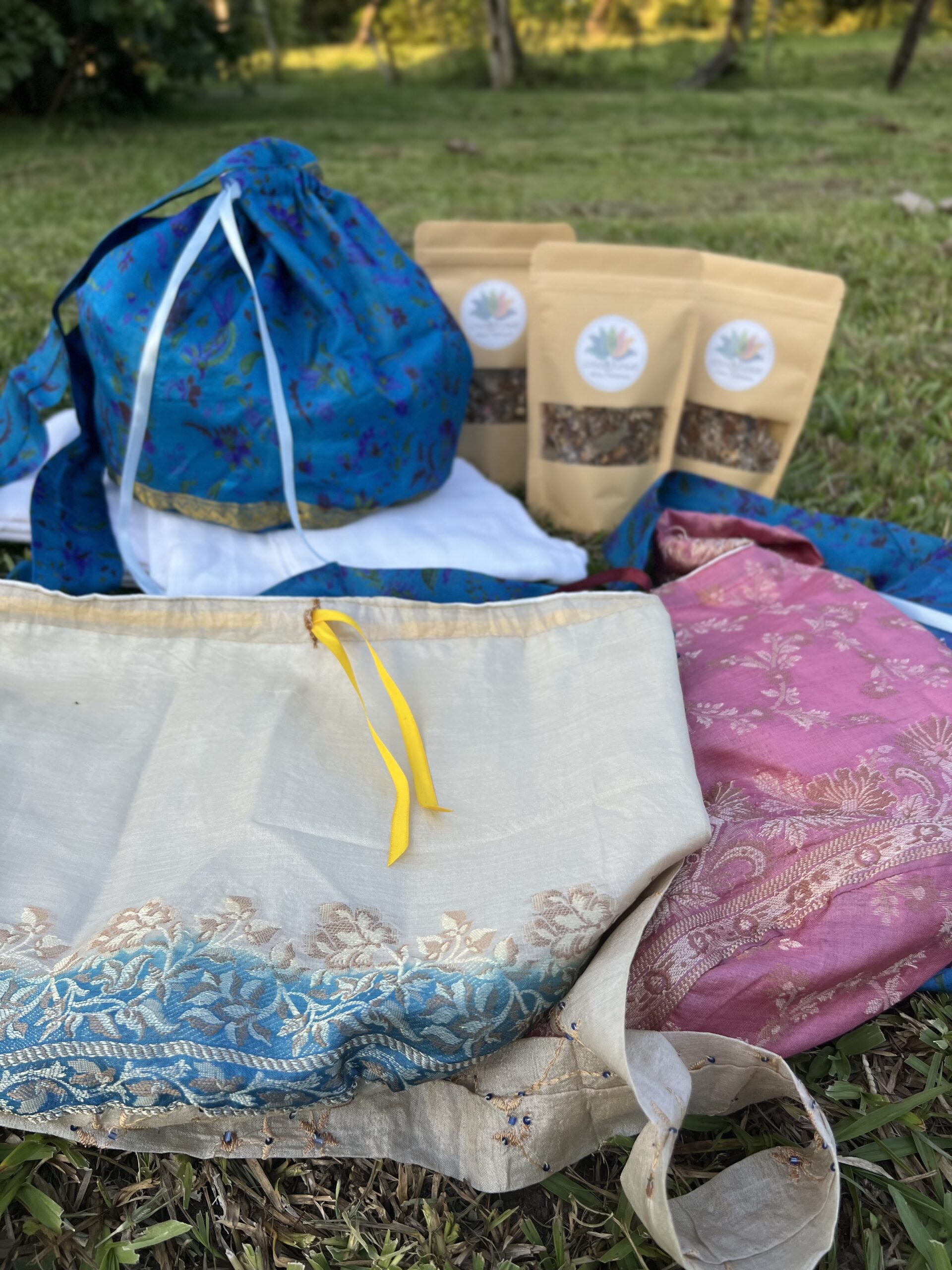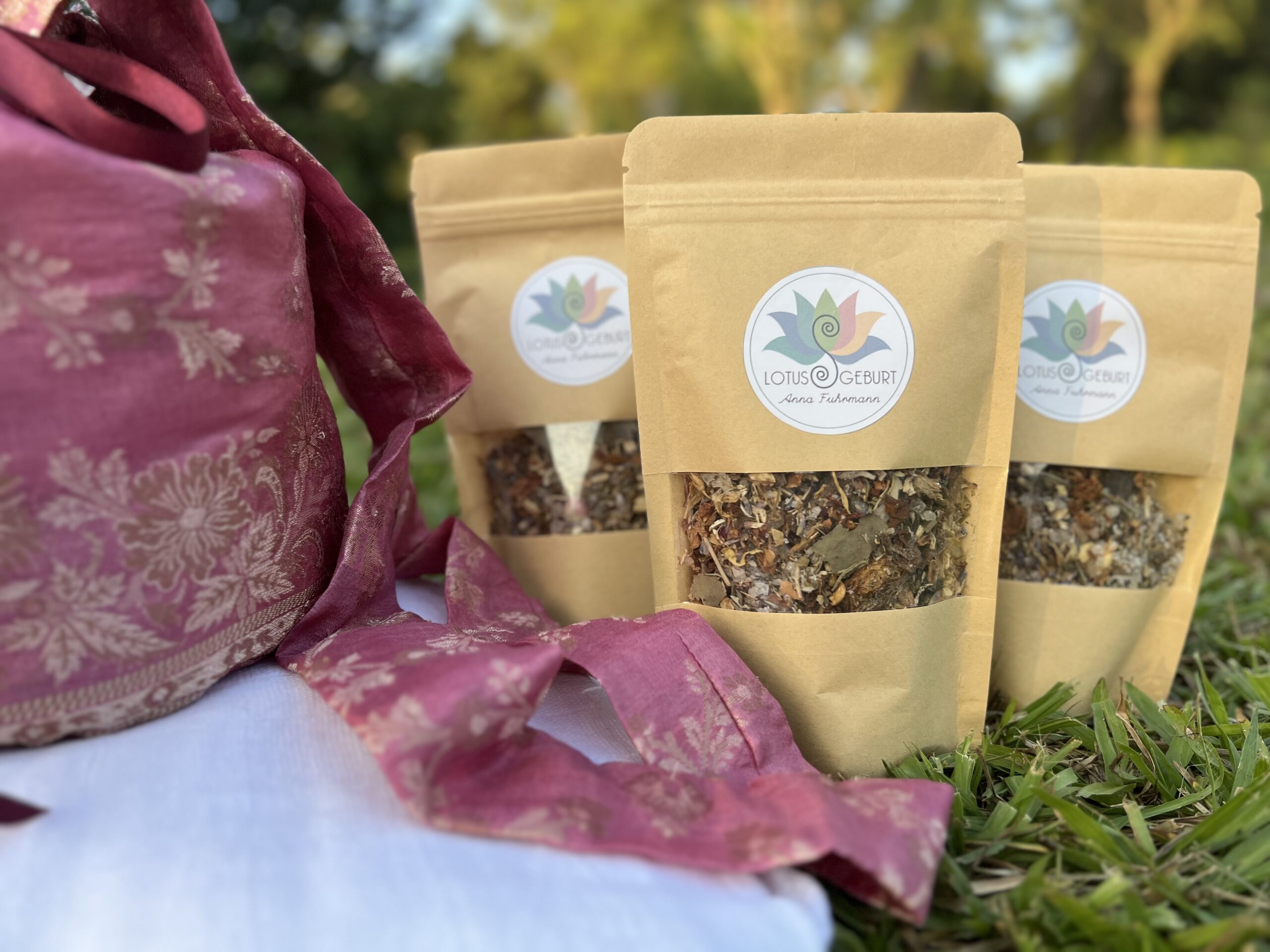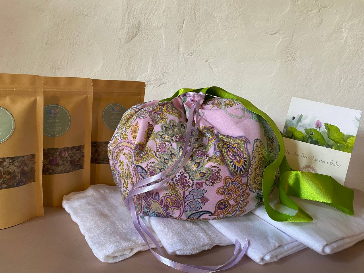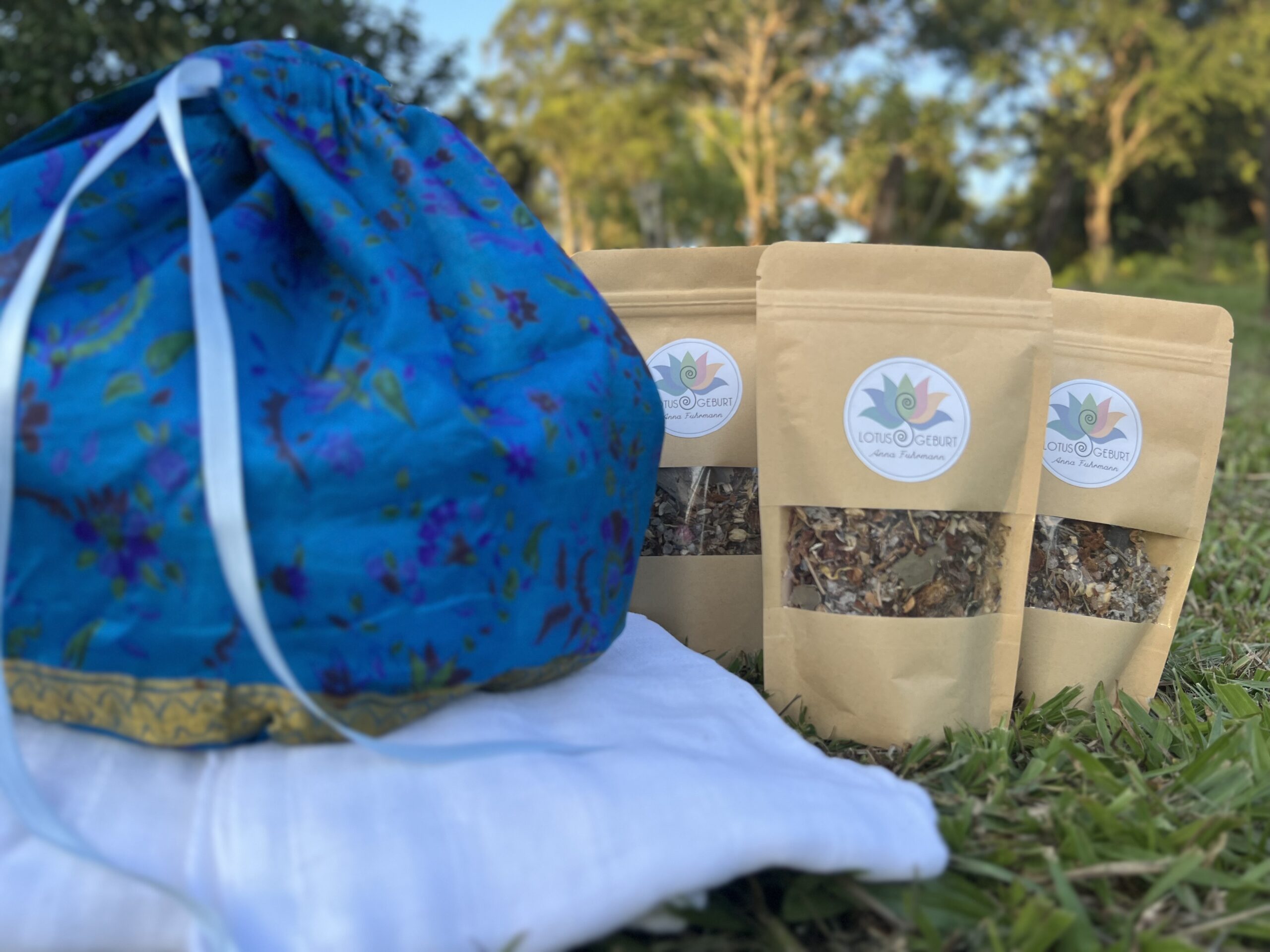 Das große 8-teilige rundum-sorglos-Paket für die Lotusgeburt besteht aus einer Plazenta-Tasche mit der Farbe deiner Wahl, 3 Kräuter-Salzmischungen mit je 180 g Inhalt, 2 Mullwindeln und 2 Moltontücher, jeweils aus reiner Baumwolle.